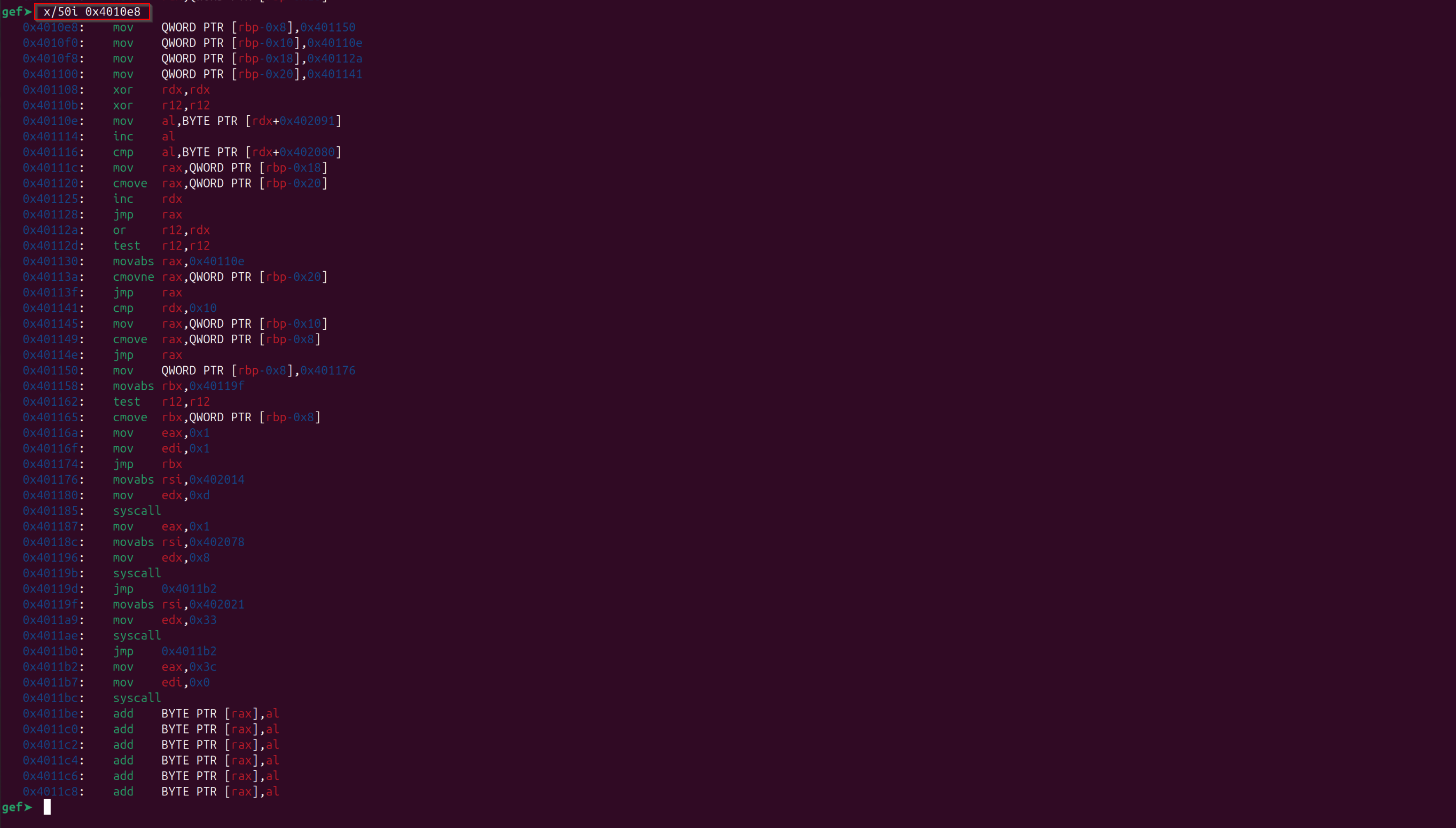 0x4010b8 mov BYTE PTR [rdx+0x402091], cl --> 0x00+0x402091 = "u"