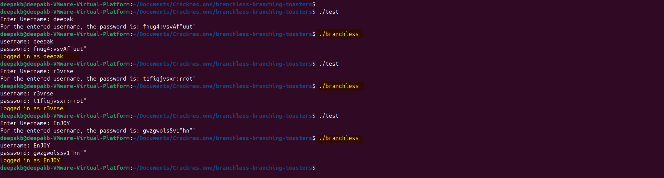 Let’s run this code and see what is the behavior of the binary output, if we provide the username, and enter the generated password from keygen: