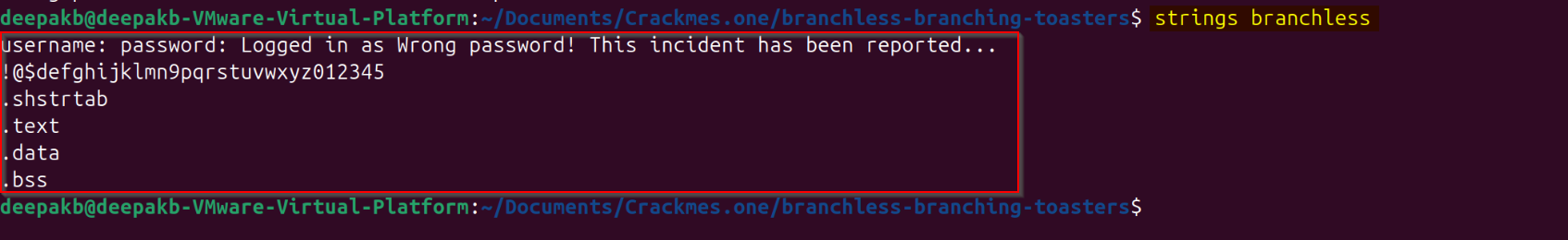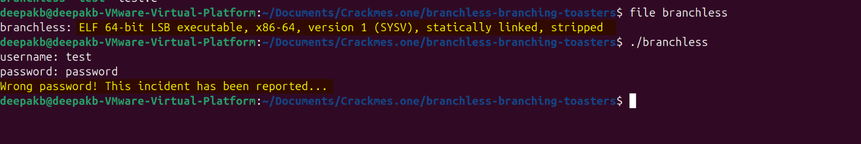 Observe that it is an ELF executable, with the symbols stripped and it prompts for “username” and “password”: