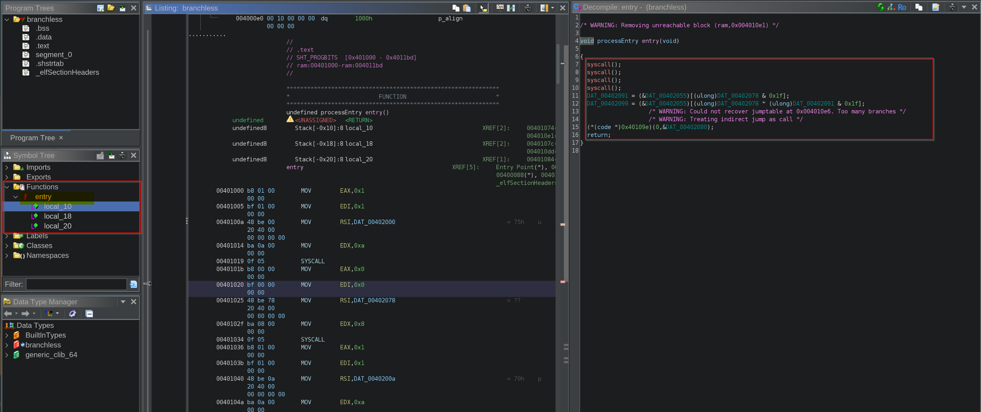 Let’s throw this binary into ghidra, and see if we could get any useful information, observe below that we could see no function other than the “entry” function and also observe that when clicked on the disassembly the de-compiled code doesn’t makes much sense, we could see keywords like: “UNRECOVERED_JUMPTABLE”, lets jump to dynamic analysis as there are no functions seems in function section.