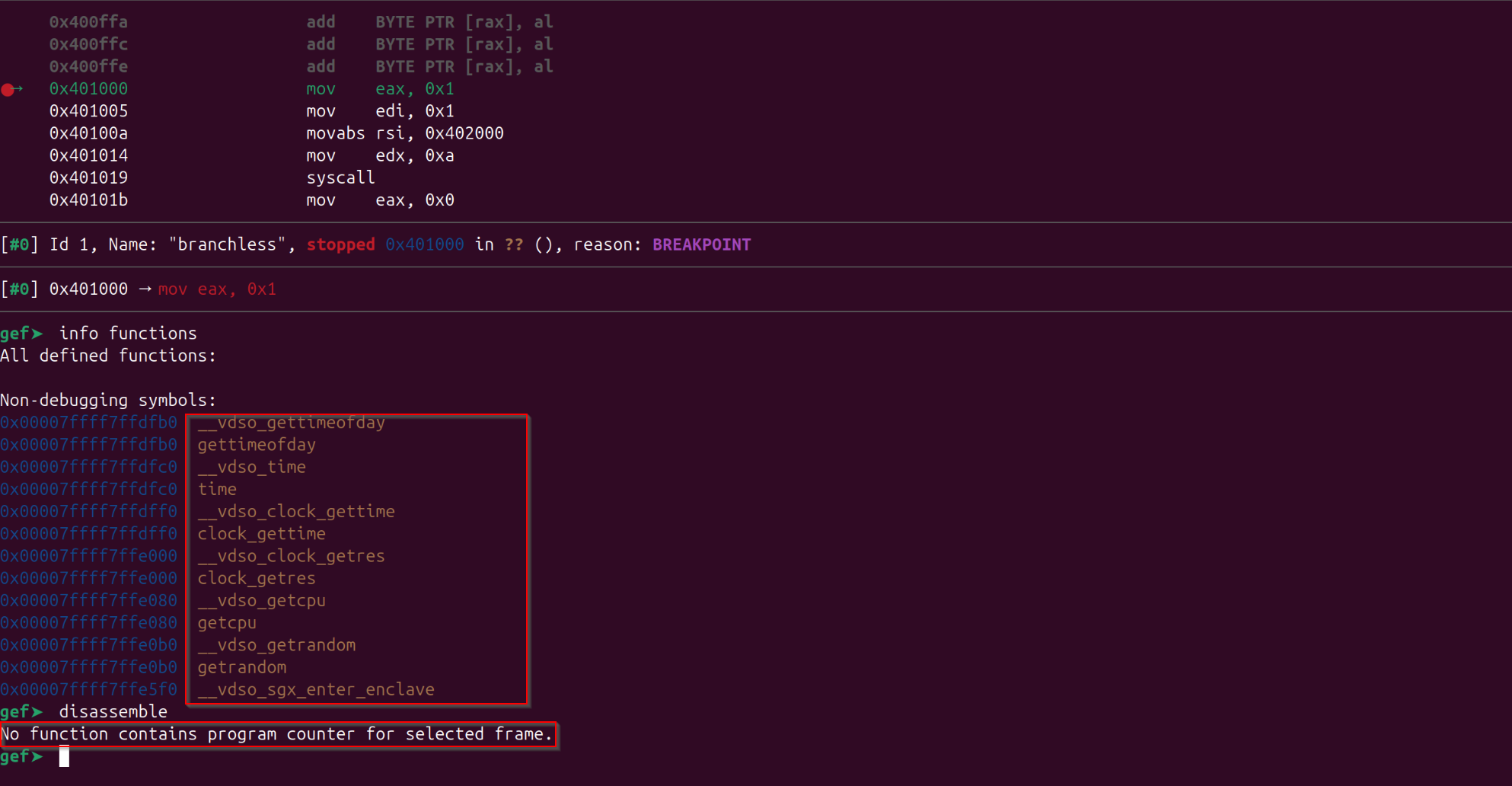 Let’s use the “start” command in gdb to have a break point at the “entry point address” of the binary, and see if we could get the disassembly in current context or if we could find information of any functions: