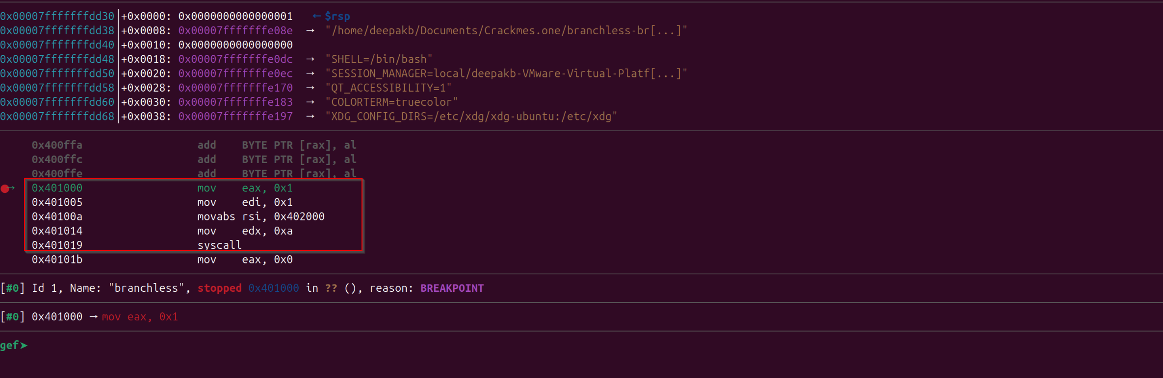 0x40119b: syscall ==> write(1, 0x402078, 8) --> Prints in console as: username of 8 length which was passed as input
