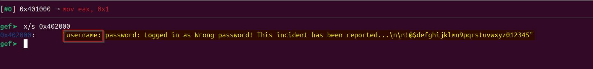 Observe that the entered username is stored in the location “0x402078”, this would be useful later on