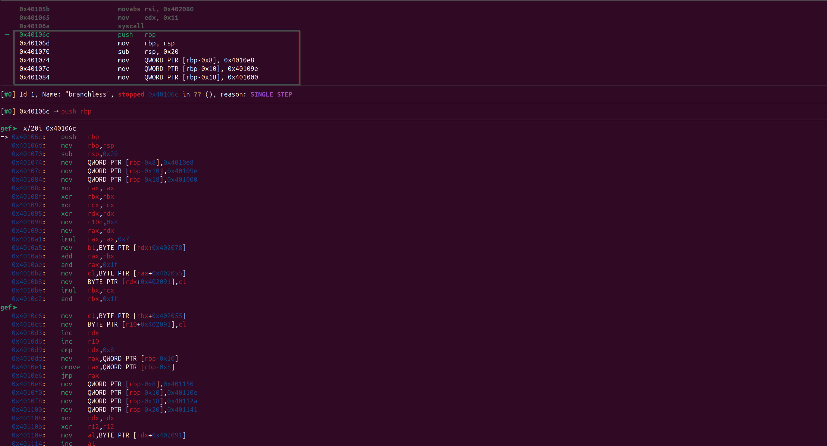 Some function prologue starts from “0x40106c” after the 4 system calls, and I have printed the upcoming 20-30 instructions that would get executed after “0x40106c”: